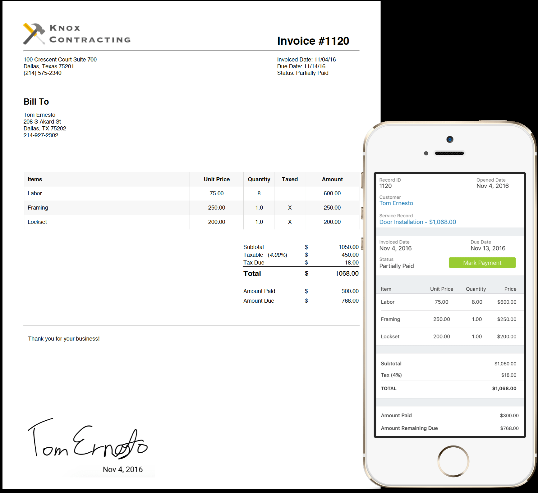 If you’re in the field or in the office, you can quickly create itemized estimates and invoices for customers. You can add line items to the invoice in different quantities with different tax applications. Good news! Subtotals, tax, and totals are automatically calculated for you. Once you create the invoice from your phone or computer, you can generate a PDF for your customer. Now you’ll never lose track of an invoice and can easily monitor what’s been paid and what hasn’t. You can also take a customer’s signature right over a phone or tablet, so they can pay right on the spot.