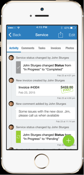 Using the system, field agents can update a job status, attach photos, and log updates on jobs right from their mobile device. All changes/updates that are logged automatically order themselves chronologically to give managers a real-time update on the job. Techs can mark the jobs a in progress, pending action, completed, or cancelled. They can also attach photos and log comments to give managers real-time progress into a job.